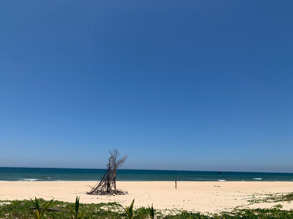 Cát dưới mông, mặt trời, mặt biển phía xa, xung quanh là tiếng sóng biển.