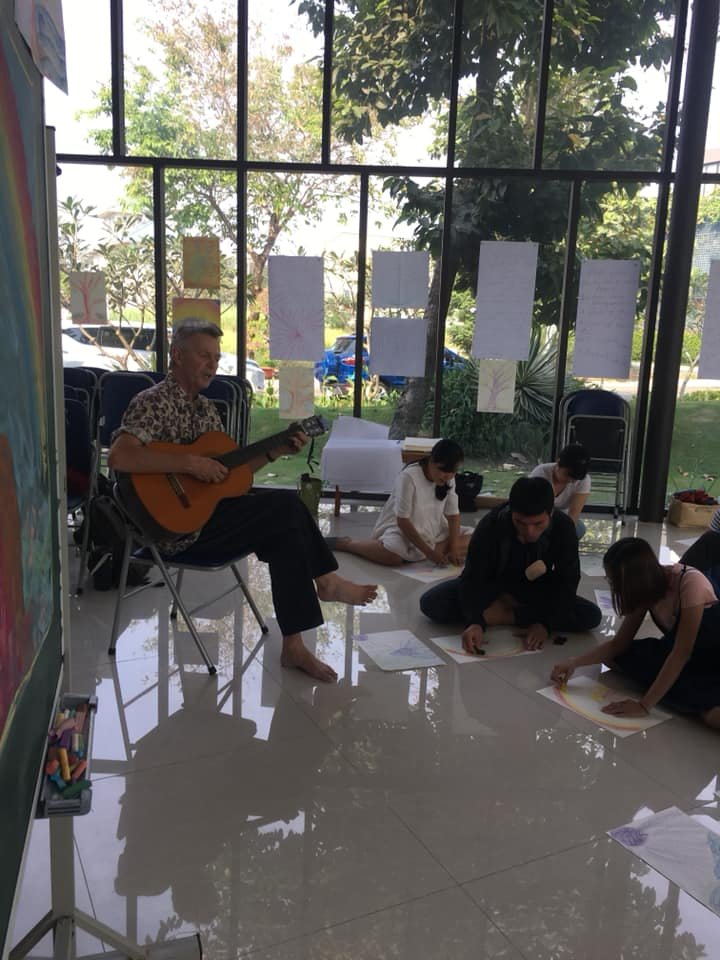 Chú thích hình: lũ học trò ngồi vẽ, và được thầy hát cho nghe. Thầy sáng tác truyện và kể thần sầu đi, câu chuyện có đan xen những bài thơ, bài hát mà chính thầy sáng tác, rồi sẽ cho lũ học trò chuyển động, múa hát, diễn kịch theo nữa. Ta nói… học mà về ba mẹ hỏi “học gì?”, toàn bảo “có học gì đâu!” là bởi thế này đây!