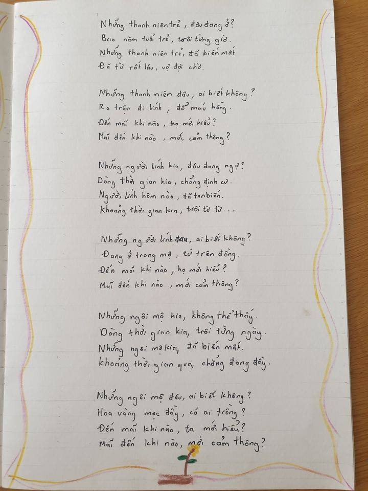 Mình đọc bài thơ này và mình chảy nước mắt! Đứng ở phương diện học sinh giỏi văn mấy năm liền ơ hơ (học sinh giỏi văn không được coi trọng bằng học sinh giỏi toán), thôi thì mình cũng có thể chia sẻ chút cảm nhận về phương diện này đi. Đối với mình, dịch được một bài thơ như vầy là đạt. Vẫn có hai ba đoạn cuối đuối sức, gieo vần hơi gượng. Song, hình ảnh các con dùng, thể hiện ý tứ các con hiểu, nó đủ đầy và đủ sâu.